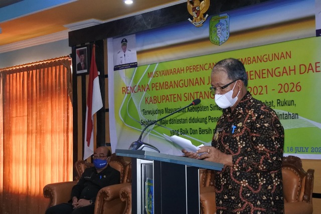 SINTANG, KALBAR- Wakil Bupati Sintang Sudiyanto, membuka pelaksanaan Musyawarah Perencanaan Pembangunan Rancangan Rencana Pembangunan Jangka Menengah Daerah (RPJMD)  Kabupaten Sintang Tahun 2021-2026 secara virtual di Aula Badan Perencanaan Pembangunan Daerah Kabupaten Sintang pada Jumat, 16 Juli 2021.