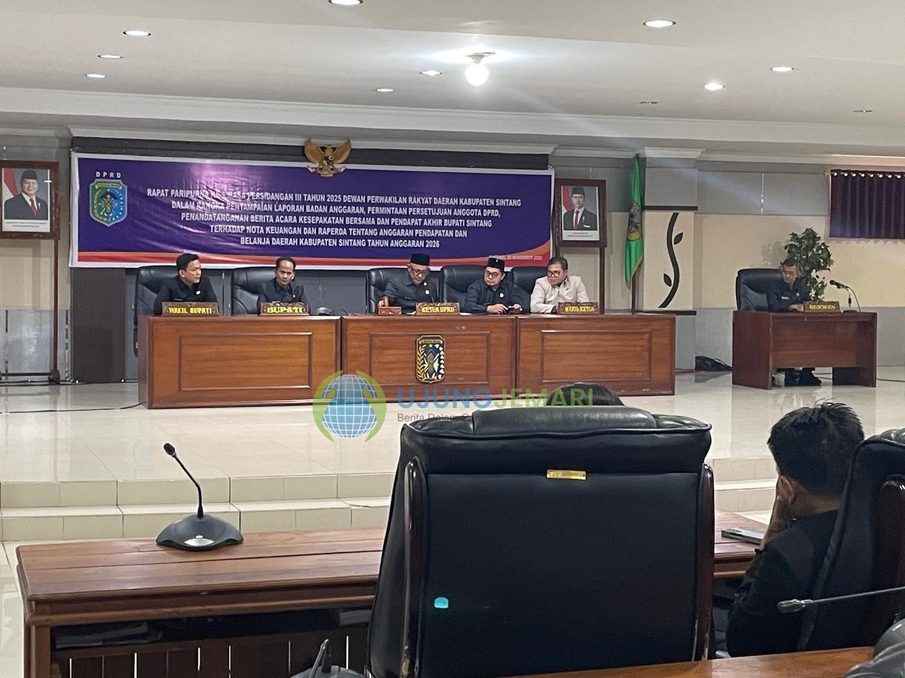 SINTANG, ujungjemari.id- DPRD Kabupaten Sintang resmi menyetujui Raperda tentang Anggaran Pendapatan dan Belanja Daerah (APBD) Tahun 2026 menjadi Peraturan Daerah. Keputusan itu diambil dalam rapat paripurna ke-9 masa persidangan ketiga tahun 2025 yang dipimpin Ketua DPRD Sintang, Indra Subekti, pada Jumat 28 November 2025.
